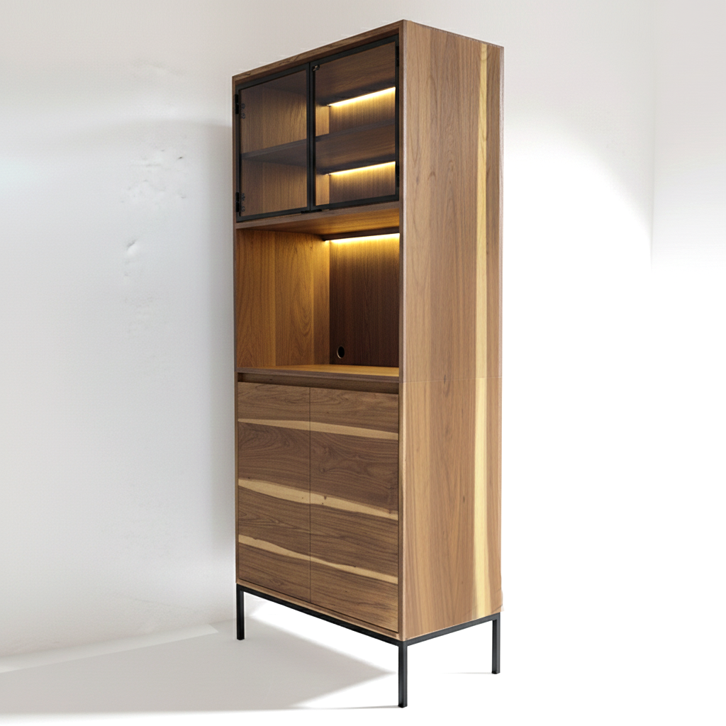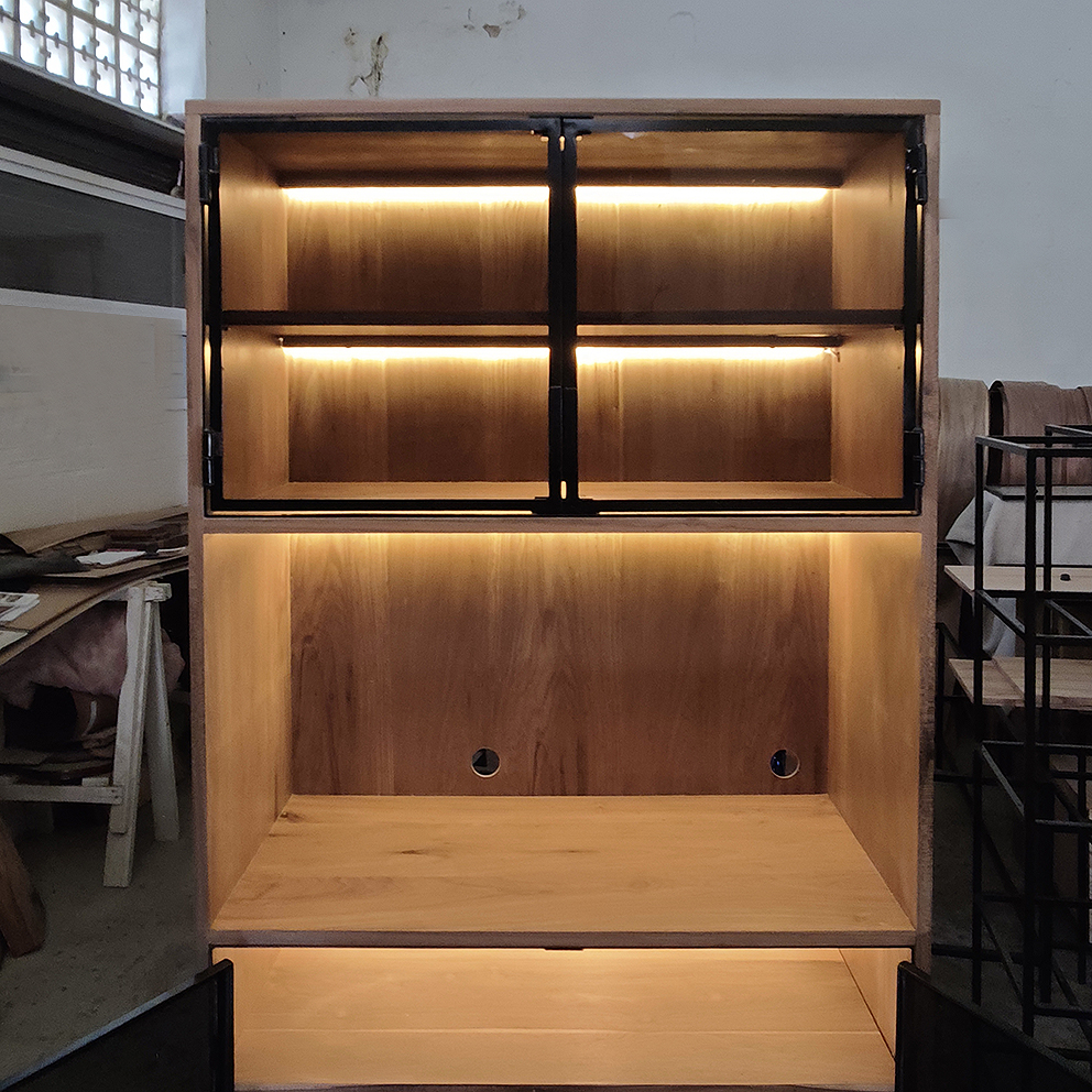 Aparador Vajillero, realizado en hierro, madera enchapada de peteribí y vidrio.